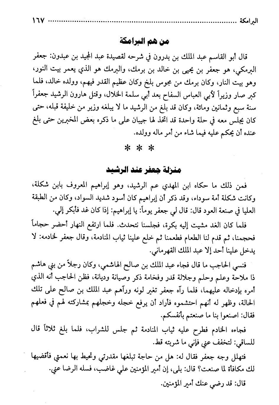 قال أبو القاسم بعد الملك بن بدرون في شرحه لقصيدة عبد المجيد بن عبدون: جعفر البرمكي، هو جعفر بن يحيى بن خالد بن برمك، والبرمك هو الذي يعمر بيت النور، وهو بيت النار، وكان برمك من مجوس بلخ وكان عظيم القدر فيهم، وولده خالد، فلما كبر صار وزيراً لأبي السفاح بعد أبي سلمة الحلال، وقتل هارون الرشيد جعفراً سنة سبع وثمانين ومائة، وكان قد بلغ من الرشيد ما لا يبلغه وزير من خليفة قبله، حتى كان يجلس معه في حلة واحدة قد اتخذ لها جيبان على ما ذكره بعض المخبرين حتى بلغ عنده أن يحكم عليه فيما شاء من أمر ماله وولده.