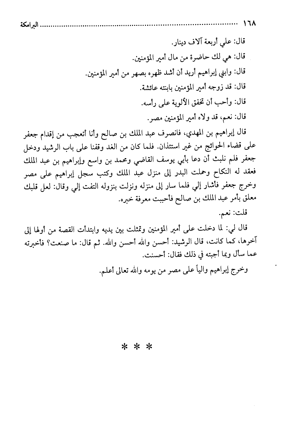 قال إبراهيم بن المهدي، فانصرف عبد الملك بن صالح وأنا أتعجب من إقدام جعفر على قضاء الحوائج من غير استئذان. فلما كان من الغد وقفنا على باب الرشيد ودخل جعفر فلم نلبث أن دعا بأبي يوسف القاضي ومحمد بن واسع وإبراهيم بن عبد الملك فعقد له النكاح وحملت البدر إلى منزل عبد الملك وكتب سجل إبراهيم على مصر وخرج جعفر فأشار إلي فلما سار إلى منزله ونزلت بنزوله التفت إلي وقال: لعل قلبك معلق بأمر عبد الملك بن صالح فأحببت معرفة خبره.