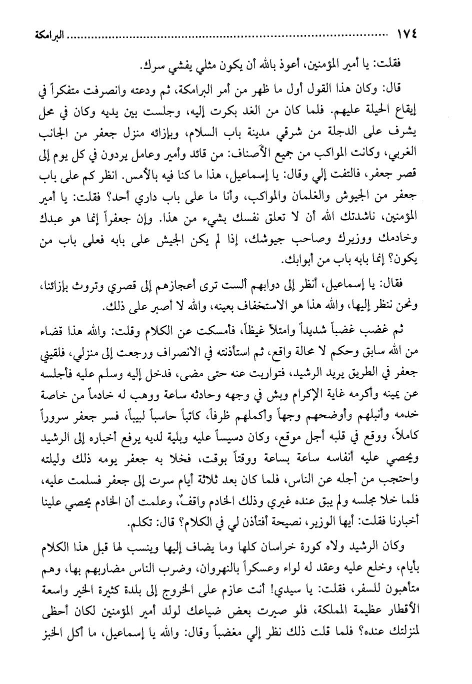 قال: وكان هذا القول أول ما ظهر من أمر البرامكة، ثم ودعته وانصرفت متفكراً في إيقاع الحيلة عليهم. فلما كان من الغد بكرت إليه، وجلست بين يديه وكان في محل يشرف على الدجلة من شرقي مدينة باب السلام، وبإزائه منزل جعفر من الجانب الغربي، وكانت المواكب من جميع الأَصناف: من قائد وأمير وعامل يردون في كل يوم إلى قصر جعفر، فالتفت إلي وقال: يا إسماعيل، هذا ما كنا فيه بالأمس. انظر كم على باب جعفر من الجيوش والغلمان والمواكب، وأنا ما على باب داري أحد؟ فقلت: يا أمير المؤمنين، ناشدتك الله أن لا تعلق نفسك بشيء من هذا. وإن جعفراً إنما هو عبدك وخادمك ووزيرك وصاحب جيوشك، إذا لم يكن الجيش على بابه فعلى باب من يكون؟ إنما بابه باب من أبوابك.