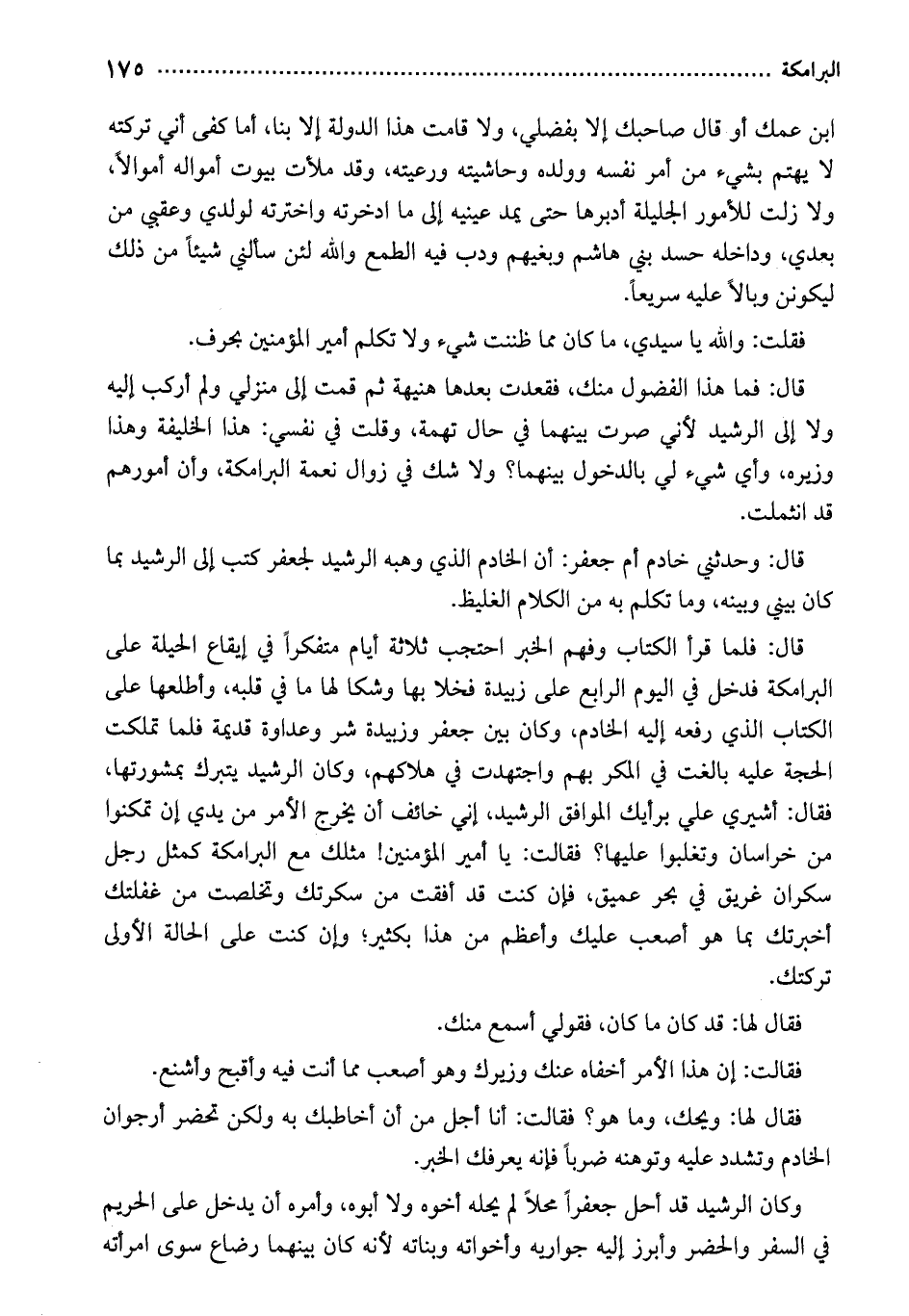 قال: فما هذا الفضول منك، فقعدت بعدها هنيهة ثم قمت إلى منزلي ولم أركب إليه ولا إلى الرشيد لأني صرت بينهما في حال تهمة، وقلت في نفسي: هذا الخليفة وهذا وزيره، وأي شيء لي بالدخول بينهما؟ ولا شك في زوال نعمة البرامكة، وأن أمورهم قد انثلمت.
