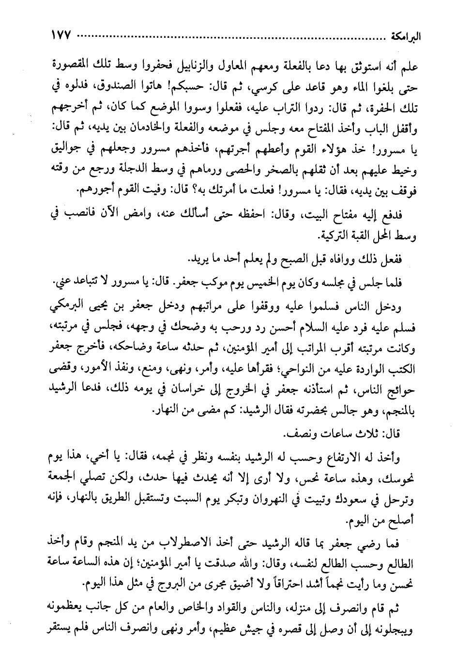 فما رضي جعفر بما قاله الرشيد حتى أخذ الاصطرلاب من يد المنجم وقام وأخذ الطالع وحسب الطالع لنفسه، وقال: والله صدقت يا أمير المؤمنين؛ إن هذه الساعة ساعة نحسن وما رأيت نجماً أشد احتراقاً ولا أضيق مجرى من البروج في مثل هذا اليوم.