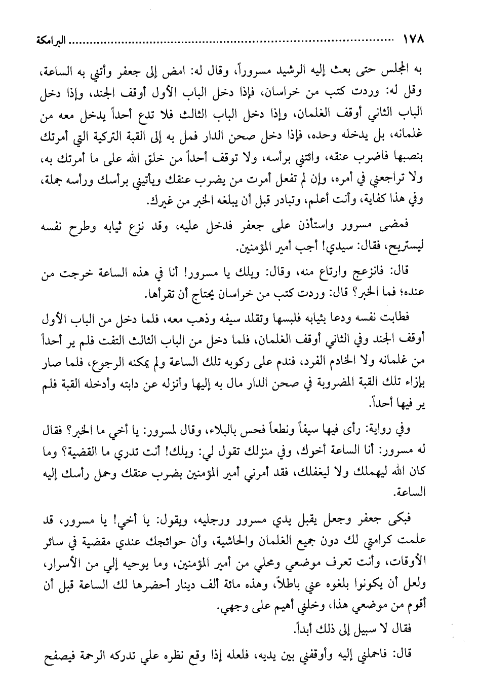 به المجلس حتى بعث إليه الرشيد مسروراً، وقال له: امض إلى جعفر وأتني به الساعة، وقل له: وردت كتب من خراسان، فإذا دخل الباب الأول أوقف الجند، وإذا دخل الباب الثاني أوقف الغلمان، وإذا دخل الباب الثالث فلا تدع أحداً يدخل معه من غلمانه، بل يدخله وحده، فإذا دخل صحن الدار فمل به إلى القبة التركية التي أمرتك بنصبها فاضرب عنقه، وائتني برأسه، ولا توقف أحداً من خلق الله على ما أمرتك به، ولا تراجعني في أمره، وإن لم تفعل أمرت من يضرب عنقك ويأتيني برأسك ورأسه جملة، وفي هذا كفاية، وأنت أعلم، وتبادر قبل أن يبلغه الخبر من غيرك.
