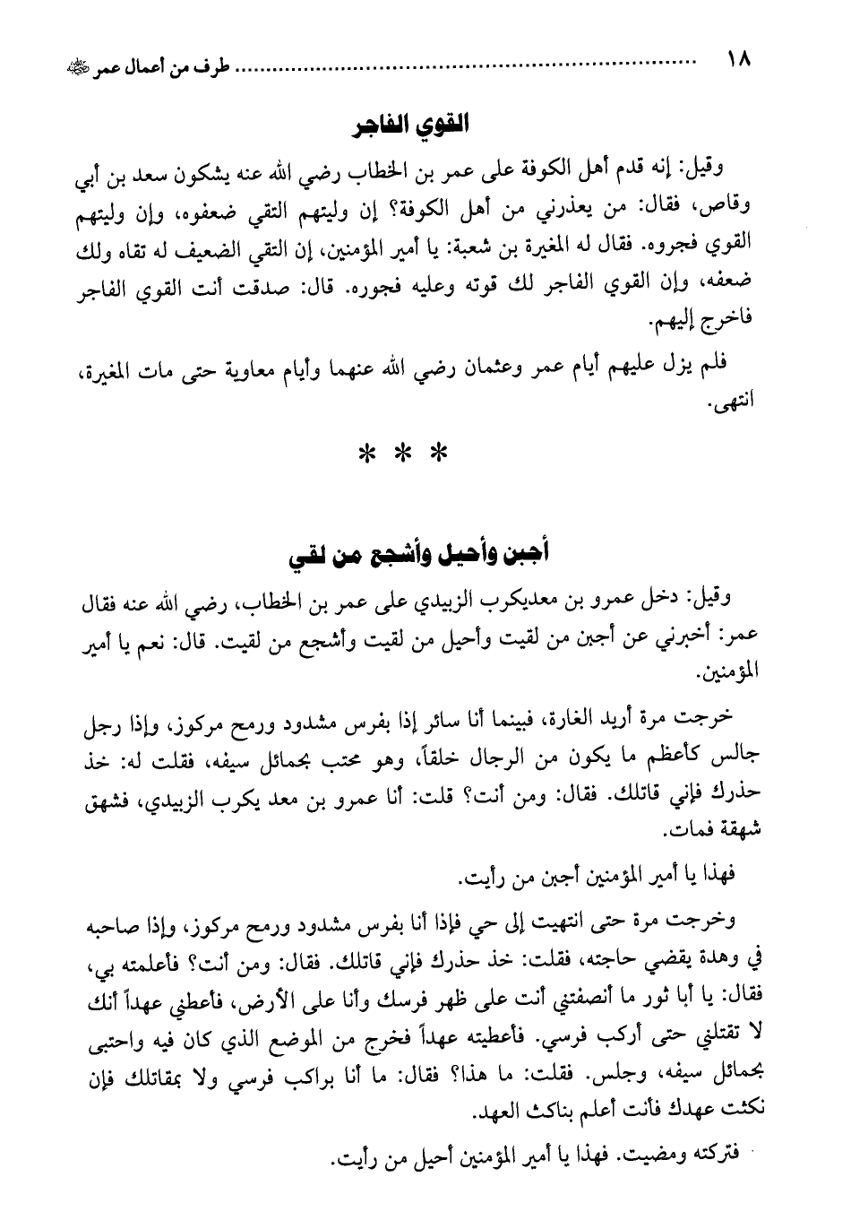 وقيل: إنه قدم أهل الكوفة على عمر بن الخطاب رضي الله عنه يشكون سعد بن أبي وقاص، فقال: من يعذرني من أهل الكوفة؟ إن وليتهم التقي ضعفوه، وإن وليتهم القوي فجروه. فقال له المغيرة بن شعبة: يا أمير المؤمنين، إن التقي الضعيف له تقاه ولك ضعفه، وإن القوي الفاجر لك قوته وعليه فجوره. قال: صدقت أنت القوي الفاجر فاخرج إليهم.