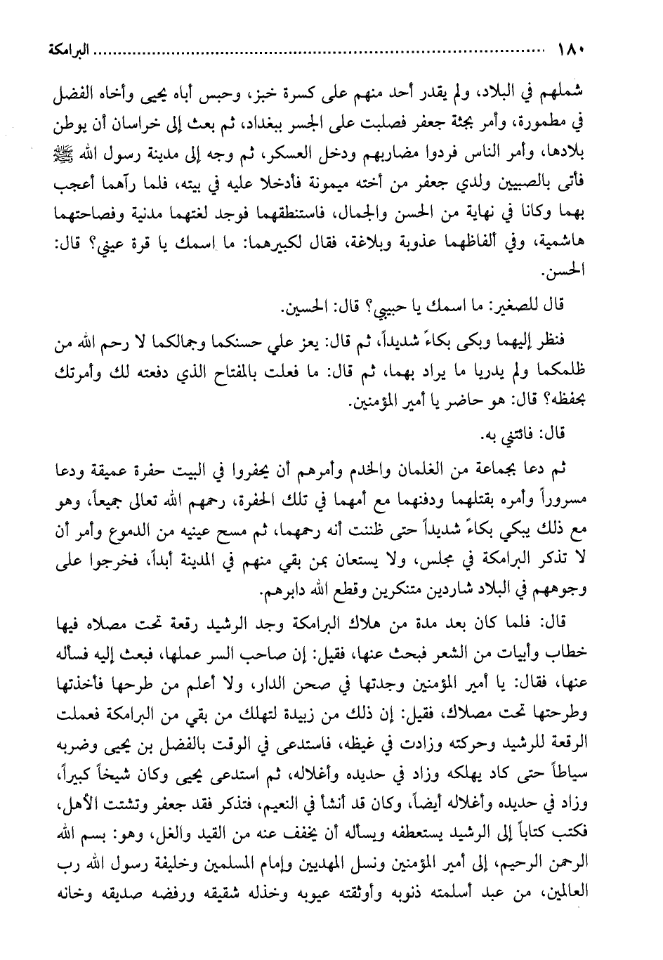 شملهم في البلاد، ولم يقدر أحد منهم على كسرة خبز، وحبس أباه يحيى وأخاه الفضل في مطمورة، وأمر بجثة جعفر فصلبت على الجسر ببغداد، ثم بعث إلى خراسان أن يوطن بلادها، وأمر الناس فردوا مضاربهم ودخل العسكر، ثم وجه إلى مدينة رسول الله صَلَّى اللهُ عَلَيْهِ وَسَلَّمَ فأتى بالصبيين ولدي جعفر من أخته ميمونة فأدخلا عليه في بيته، فلما رآهما أعجب بهما وكانا في نهاية من الحسن والجمال، فاستنطقهما فوجد لغتهما مدنية وفصاحتها هاشمية، وفي ألفاظهما عذوبة وبلاغة، فقال لكبيرهما: ما اسمك يا قرة عيني؟ قال: الحسن.