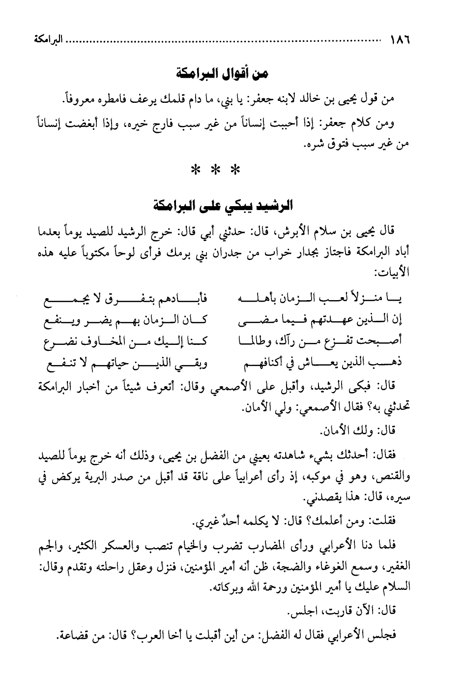 قال: فبكى الرشيد، وأقبل على الأصمعي وقال: أتعرف شيئاً من أخبار البرامكة تحدثني به؟ فقال الأصمعي: ولي الأمان.