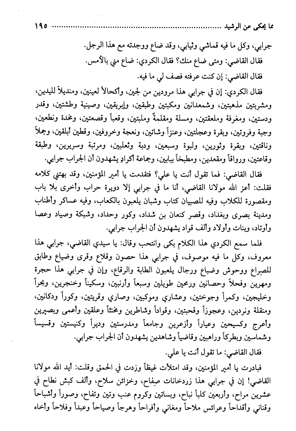 فبادرت يا أمير المؤمنين، وقد امتلأت غيظاً وزدت في الحمق وقلت: أيد الله مولانا القاضي! إن في جرابي هذا زردخانات صِفاح، وخزائن سلاح، وألف كبش نطاح في عشرين مراح، وأربعين كلباً نباح، وبساتين وكروم عنب وتين وتفاح، وصوراً وأشباحاً وقناني وأقداحاً وعرائس ملاحاً ومغاني وأفراحاً وهرجاً وصياحاً وعبداً وفلاحاً وأخاه