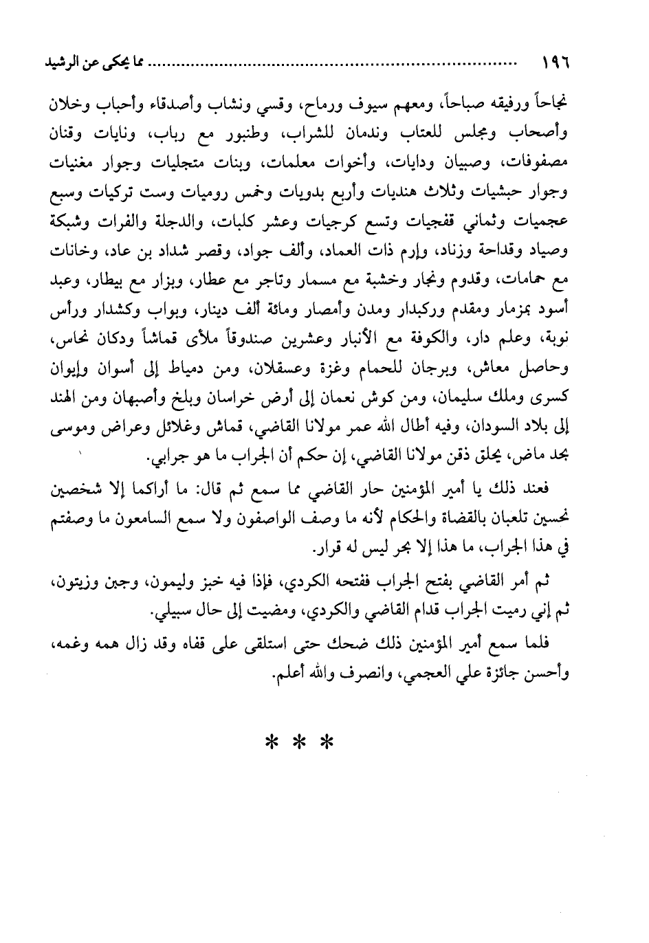 نجاحاً ورفيقه صباحاً، ومعهم سيوف ورماح، وقسي ونشاب وأصدقاء وأحباب وخلان وأصحاب ومجلس للعتاب وندمان للشراب، وطنبور مع رباب، ونايات وقنان مصفوفات، وصبيان ودايات، وأخوات معلمات، وبنات متجليات وجوار مغنيات وجوار حبشيات وثلاث هنديات وأربع بدويات وخمس روميات وست تركيات وسبع عجميات وثماني قفجيات وتسع كرجيات وعشر كلبات، والدجلة الفرات وشبكة وصياد وقداحة وزناد، وإرم ذات العماد، وألف جواد، وقصر شداد بن عاد، وخانات مع حمامات، وقدوم ونجار وخشبة مع مسمار وتاجر مع عطار، وبزار مع بيطار، وعبد أسود بمزمار ومقدم وركبدار ومدن وأمصار ومائة ألف دينار، وبواب وكشدار ورأس نوبة، وعلم دار، والكوفة مع الأنبار وعشرين صندوقاً ملأى قماشاً ودكان نحاس، وحاصل معاش، وبرجان للحمام وغزة وعسقلان، ومن دمياط إلى أسوان وإيوان كسرى وملك سليمان، ومن كوش نعمان إلى أرض خراسان وبلخ وأصبهان ومن الهند إلى بلاد السودان، وفيه أطال الله عمر مولانا القاضي، قماش وغلائل وعراض وموسى بحد ماض، يحلق ذقن مولانا القاضي، إن حكم أن الجراب ما هو جرابي.