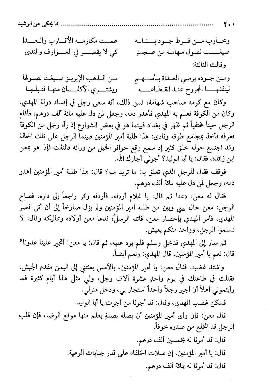 فوقف فقال للرجل الذي تعلق به: ما تريد منه؟ قال: هذا طلبة أمير المؤمنين أهدر دمه، وجعل لمن دل عليه مائة ألف درهم.