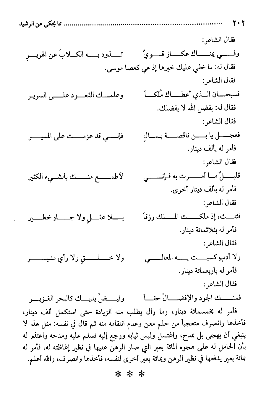 فأمر له بخمسمائة دينار، وما زال يطلب منه الزيادة حتى استكمل ألف دينار، فأخذها وانصرف متعجباً من حلم معن وعدم انتقامه منه ثم قال في نفسه: مثل هذا لا ينبغي أن يهجى بل يمدح، واغتسل ولبس ثيابه ورجع إليه فسلم عليه ومدحه واعتذر له بأن الحامل له على هجوه المائة بعير التي صار الرهن عليها في نظير إغاظته له، فأمر له بمائة بعير يدفعها في نظير الرهن وبمائة بعير أخرى لنفسه، فأخذها وانصرف، والله أعلم.
