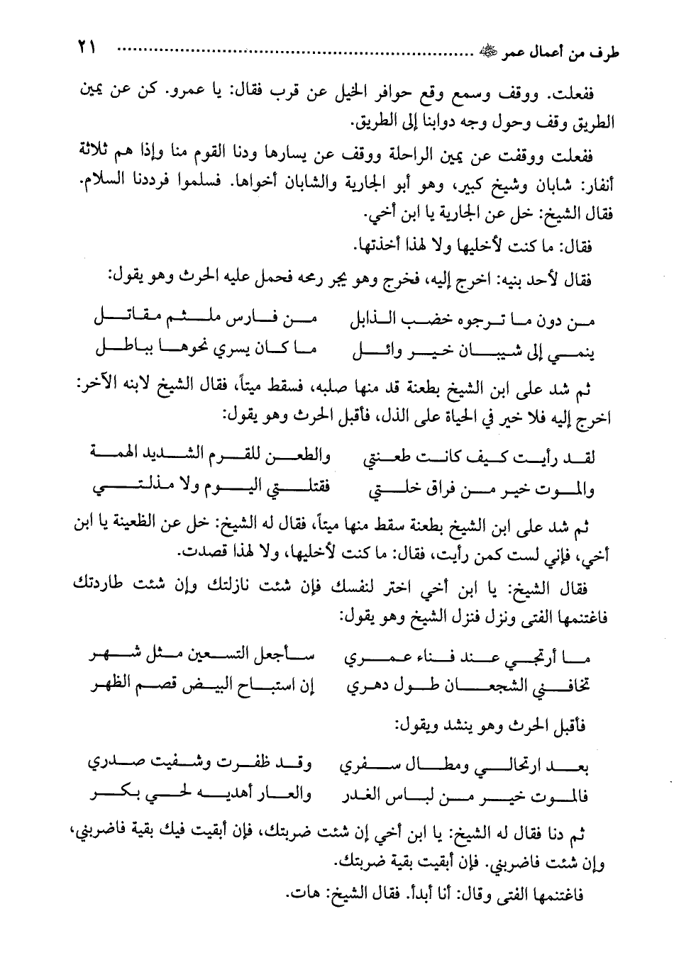 ثم شد على ابن الشيخ بطعنة سقط منها ميتاً، فقال له الشيخ: خل عن الظعينة يا ابن أخي، فإني لست كمن رأيت، فقال: ما كنت لأخليها، ولا لهذا قصدت.