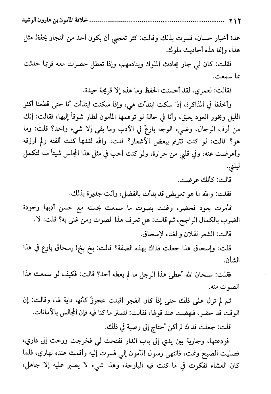 وأخذنا في المذاكرة، إذا سكت ابتدأت هي، وإذا سكتت ابتدأت أنا حتى قطعنا أكثر الليل وبخور العود يعبق، وأنا في حالة لو توهمها المأمون لطار شوقاً إليها، فقالت: إنك من أرف الرجال، وضيء الوجه بارعٌ في الأدب وما بقي إلا شيء واحد؟ قلت: وما هو؟ قالت: لو كنت تترنم ببعض الأشعار؟ قلت: والله لقديماً كنت ألفته ولم أرزقه وأعرضت عنه، وفي قلبي من حرارة، ولو كنت أحب في مثل هذا المجلس شيئاً منه لتكمل ليلتي.
