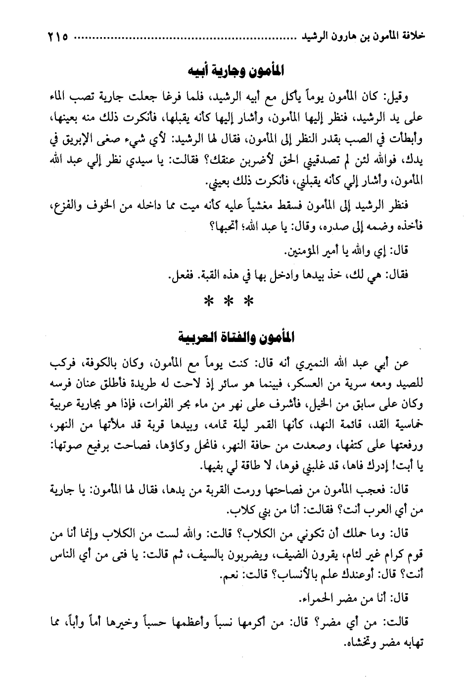 قال: فعجب المأمون من فصاحتها ورمت القربة من يدها، فقال لها المأمون: يا جارية من أي العرب أنت؟ فقالت: أنا من بني كلاب.
