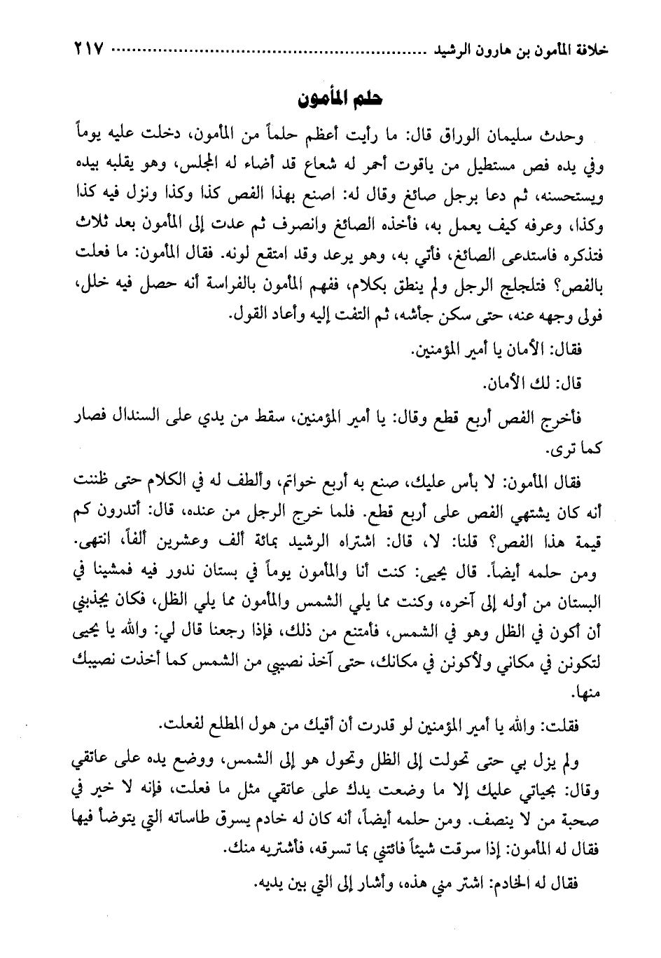 ولم يزل بي حتى تحولت إلى الظل وتحول هو إلى الشمس، ووضع يده على عاتقي وقال: بحياتي عليك إلا ما وضعت يدك على عاتقي مثل ما فعلت، فإنه لا خير في صحبة من لا ينصف. ومن حلمه أيضاً، أنه كان له خادم يسرق طاساته التي يتوضأ فيها فقال له المأمون: إذا سرقت شيئاً فائتني بما تسرقه، فأشتريه منك.