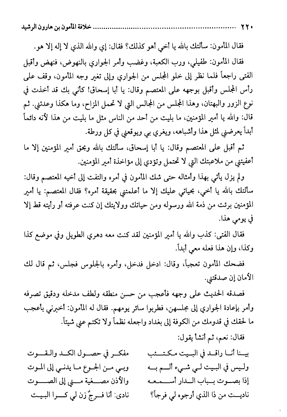 فقال المأمون: طفيلي، ورب الكعبة، وغضب وأمر الجواري بالنهوض، فنهض وأقبل الفتى راجعاً فلما نظر إلى خلو المجلس من الجواري وإلى تغير وجه المأمون، وقف على رأس المجلس وأقبل بوجهه على المعتصم وقال: يا أبا إسحاق! كأني بك قد أخذت في نوع الزور والبهتان، وهذا المجلس من المجالس التي لا تحمل المزاح، وما هكذا وعدتني. ثم قل: والله يا أمير المؤمنين، ما بليت من أحد من الناس مثل ما بليت من هذا لأنه دائماً أبداً يعرضني لمثل هذا وأشباهه، ويغري بي ويوقعني في كل ورطة.