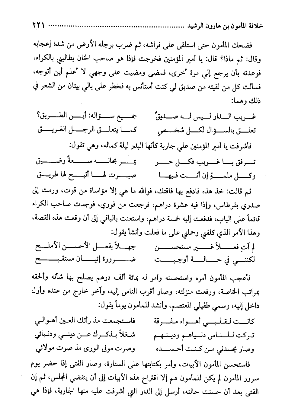 فضحك المأمون حتى استلقى على فراشه، ثم ضرب برجله الأرض من شدة إعجابه وقال: ثم ماذا؟ قال: يا أمير المؤمنين فخرجت فإذا هو صاحب الخان يطالبني بالكراء، فوعدته بأن يرجع إلي مرة أخرى، فمضى ومضيت على وجهي لا أعلم أين أتوجه، فسألت كل من لقيته من صديق لي كنت أستأنس به فخطر على بالي بيتان من الشعر في ذلك وهما.