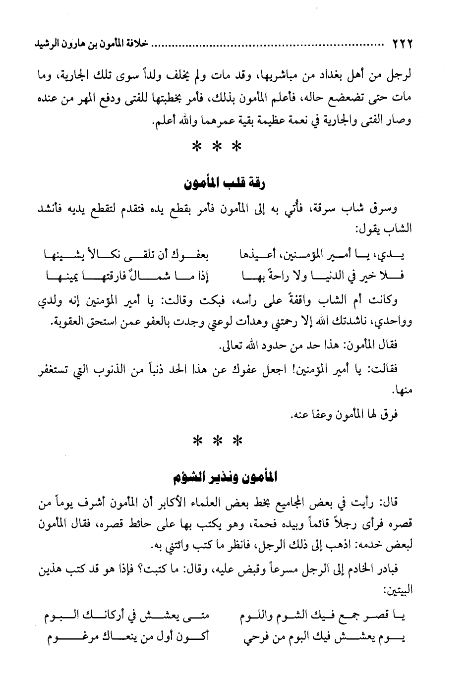 قال: رأيت في بعض المجاميع بخط بعض العلماء الأكابر أن المأمون أشرف يوماً من قصره فرأى رجلاً قائماً وبيده فحمة، وهو يكتب بها على حائط قصره، فقال المأمون لبعض خدمه: اذهب إلى ذلك الرجل، فانظر ما كتب وائتني به.