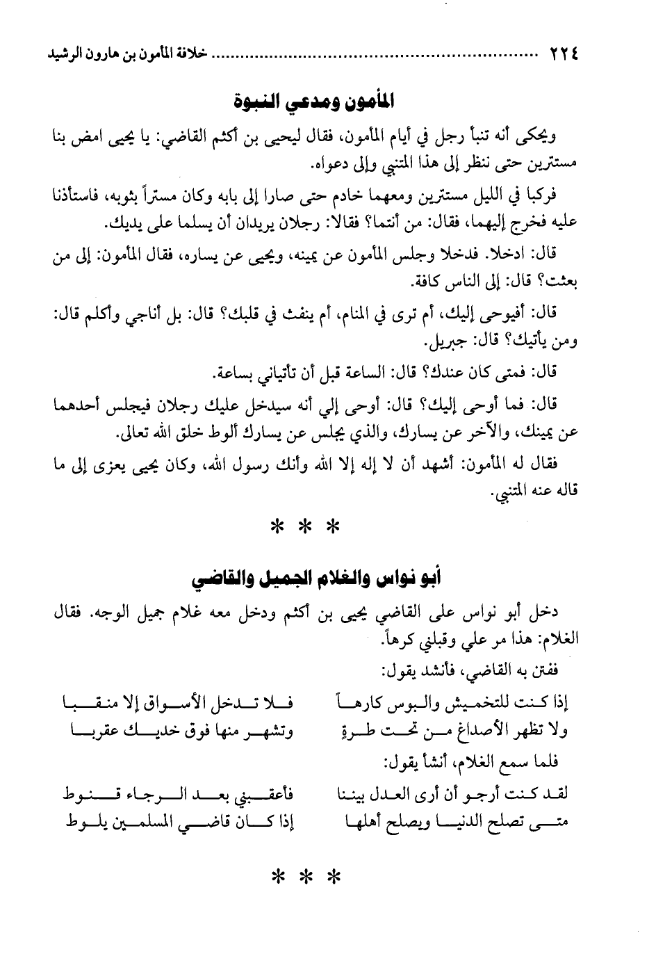 ويحكى أنه تنبأ رجل في أيام المأمون، فقل ليحيى بن أكثم القاضي: يا يحيى امض بنا مستترين حتى ننظر إلى هذا المتنبي وإلى دعواه.