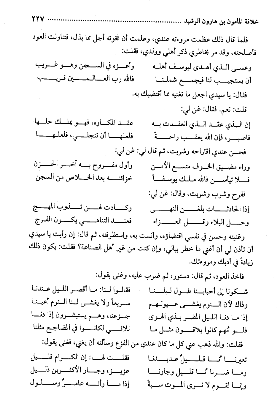 وغنيته وحسن في نفسي اقتضاؤه، وأنست به، واستظرفته، ثم قال: إن رأيت يا سيدي أن تأذن لي أن أغني ما خطر ببالي، وإن كنت من غير أهل الصناعة؟ فقلت: يكون ذلك زيادةً في أدبك ومروءتك.
