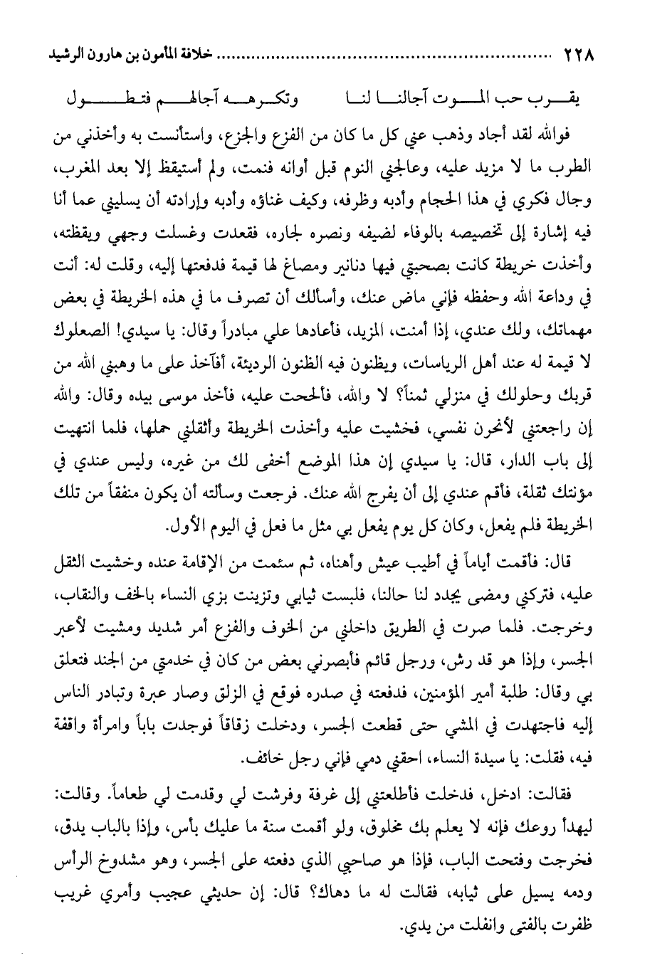 قال: فأقمت أياماً في أطيب عيش وأهناه، ثم سئمت من الإقامة عنده وخشيت الثقل عليه، فتركني ومضى يجدد لنا حالنا، فلبست ثيابي وتزينت بزي النساء بالخف والنقاب، وخرجت. فلما صرت في الطريق داخلني من الخوف والفزع أمر شديد ومشيت لأعبر الجسر، وإذا هو قد رش، ورجل قائم فأبصرني بعض من كان في خدمتي من الجند فتعلق بين وقال: طلبة أمير المؤمنين، فدفعته في صدره فوقع في الزلق وصار عبرة وتبادر الناس إليه فاجتهدت في المشي حتى قطعت الجسر، ودخلت زقاقاً فوجدت باباً وامرأة واقفة فيه، فقلت: يا سيدة النساء، احقني دمي فإني رجل خائف.