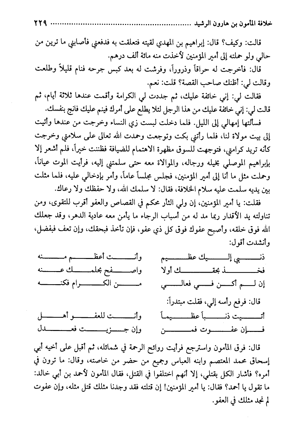 فقلت: يا أمير المؤمنين، إن ولي الثأر محكم في القصاص والعفو أقرب للتقوى، ومن تناولته يد الأقدار ربما مد له من أسباب الرجاء ما يأمن معه عادية الدهر، وقد جعلك الله فوق خلقه، وأصبح عفوك فوق كل ذي عفو، فإن تأخذ فبحقك، وإن تعف فبفضل، وأنشدت أقول: