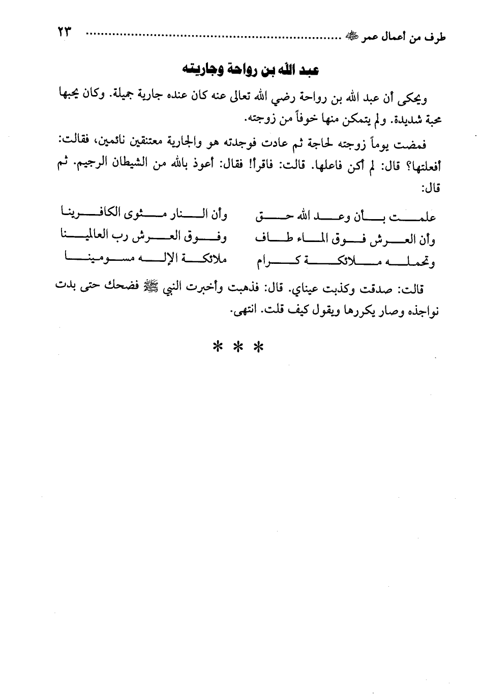 ويحكى أن عبد الله بن رواحة رضي الله تعالى عنه كان عنده جارية جميلة. وكان يحبها محبة شديدة. ولم يتمكن منها خوفاً من زوجته. فمضت يوماً زوجته لحاجة ثم عادت فوجدته هو والجارية معتنقين نائمين، فقالت: أفعلتها؟ قال: لم أكن فاعلها. قالت: فاقرأ! فقال: أعوذ بالله من الشيطان الرجيم. ثم قال: