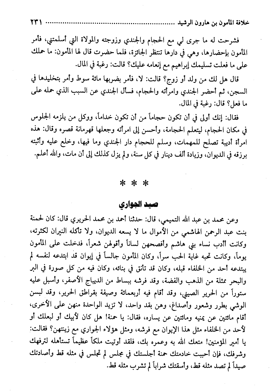 فقال: إنك أولى في أن تكون حجاماً من أن تكون خداماً، ووكل من يلزمه الجلوس في مكان الحجام، ليتعلم الحجامة، وأحسن إلى امرأته وجعلها قهرمانة قصره وقال: هذه امرأة أديبة تصلح للمهمات، وسلم للحجام دار الجندي وما فيها، وخلع عليه وأثبته برزقه في الديوان، وزيادة ألف دينار في كل سنة، ولم يزل كذلك إلى أن مات، والله أعلم.