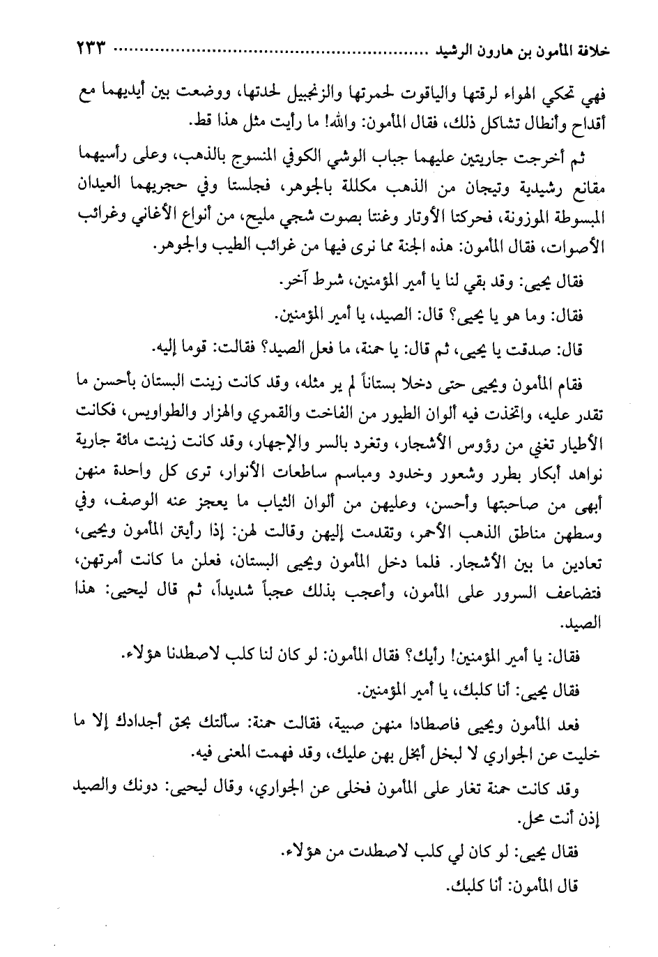 فقام المأمون ويحيى حتى دخلا بستاناً لم ير مثله، وقد كانت زينت البستان بأحسن ما تقدر عليه، واتخذت فيه ألوان الطيور من الفاخت والقمري والهزار والطواويس، فكانت الأطيار تغني من رؤوس الأشجار، وتغرد بالسر والإجهار، وقد كانت زينت مائة جارية نواهد أبكار بطرر وشعور وخدود ومباسم ساطعات الأنوار، ترى كل واحدة منهن أبهى من صاحبتها وأحسن، وعليهن من ألوان الثياب ما يعجز عنه الوصف، وفي وسطهن مناطق الذهب الأحمر، وتقدمت إليهن وقالت لهن: إذا رأيتن المأمون ويحيى، تعادين ما بين الأشجار. فلما دخل المأمون ويحيى لابستان، فعلن ما كانت أمرتهن، فتضاعف السرور على المأمون، وأعجب بذلك عجباً شديداً، ثم قال ليحيى: هذا الصيد.