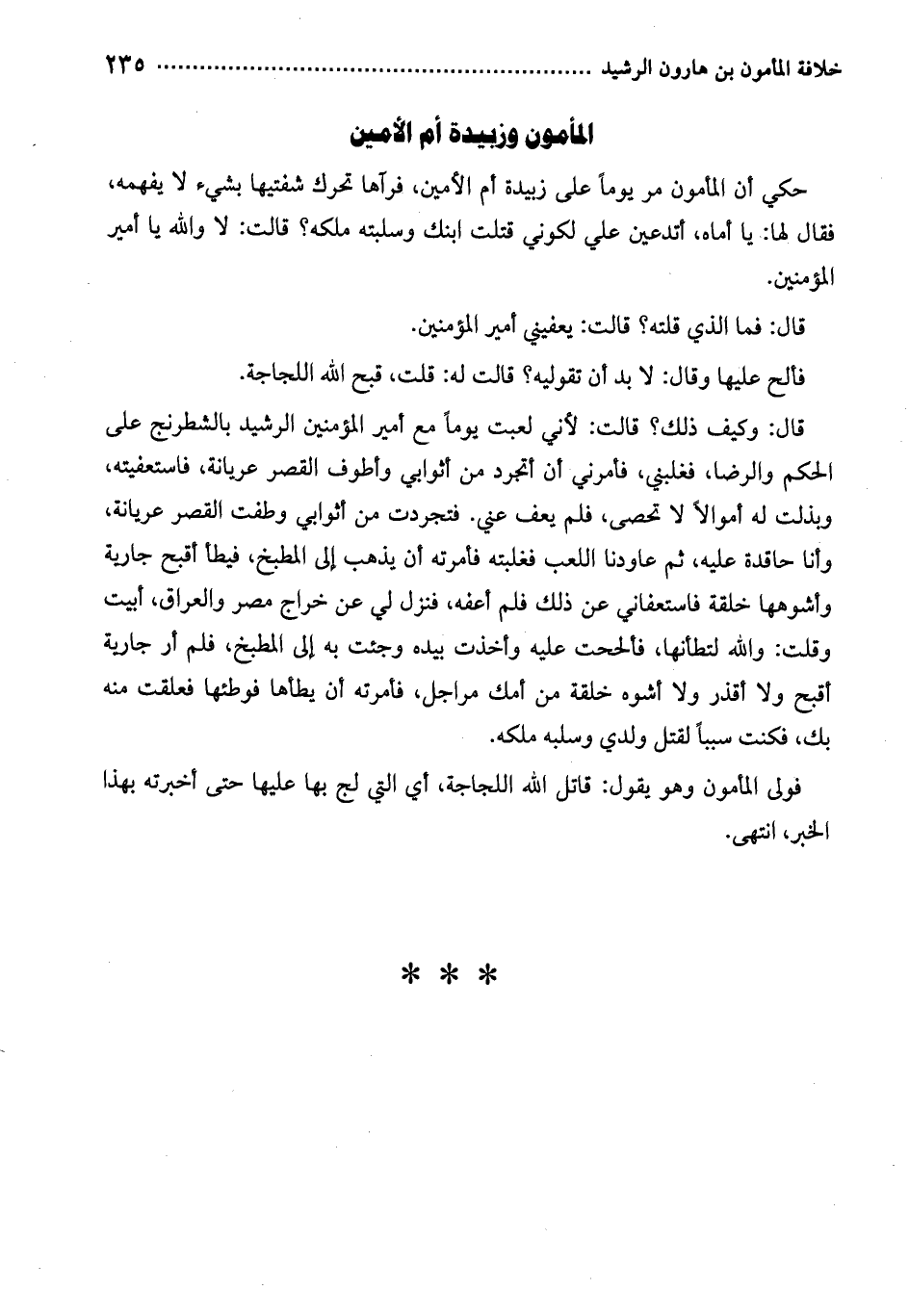 حكي أن المأمون مر يوماً على زبيدة أم الأمين، فرآها تحرك شفتيها بشيء لا يفهمه، فقال لها: يا أماه، أتدعين علي لكوني قتلت ابنك وسلبته ملكه؟ قالت: لا والله يا أمير المؤمنين.