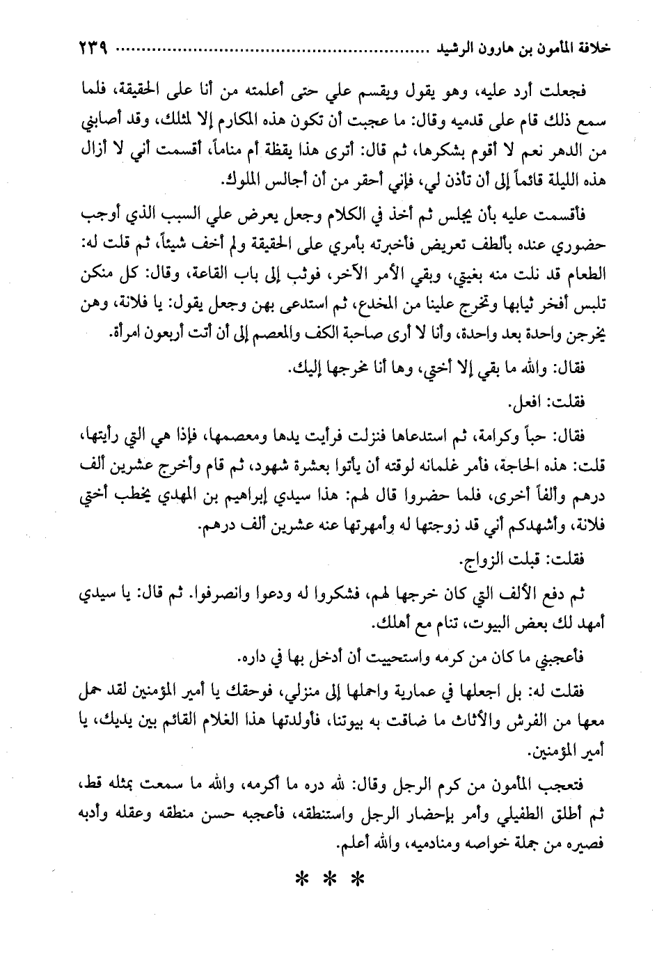 فأقسمت عليه بأن يجلس ثم أخذ في الكلام وجعل يعرض علي السبب الذي أوجب حضوري عنده بألطف تعريض فأخبرته بأمري على الحقيقة ولم أخف شيئاً، ثم قلت له: الطعام قد نلت منه بغيتي، وبقي الأمر الآخر، فوثب إلى باب القاعة، وقال: كل منكن تلبس أفخر ثيابها وتخرج علينا من المخدع، ثم استدعى بهن وجعل يقول: يا فلانة، وهن يخرجن واحدة بعد واحدة، وأنا لا أرى صاحبة الكف والمعصم إلى أن أتت أربعون امرأة.