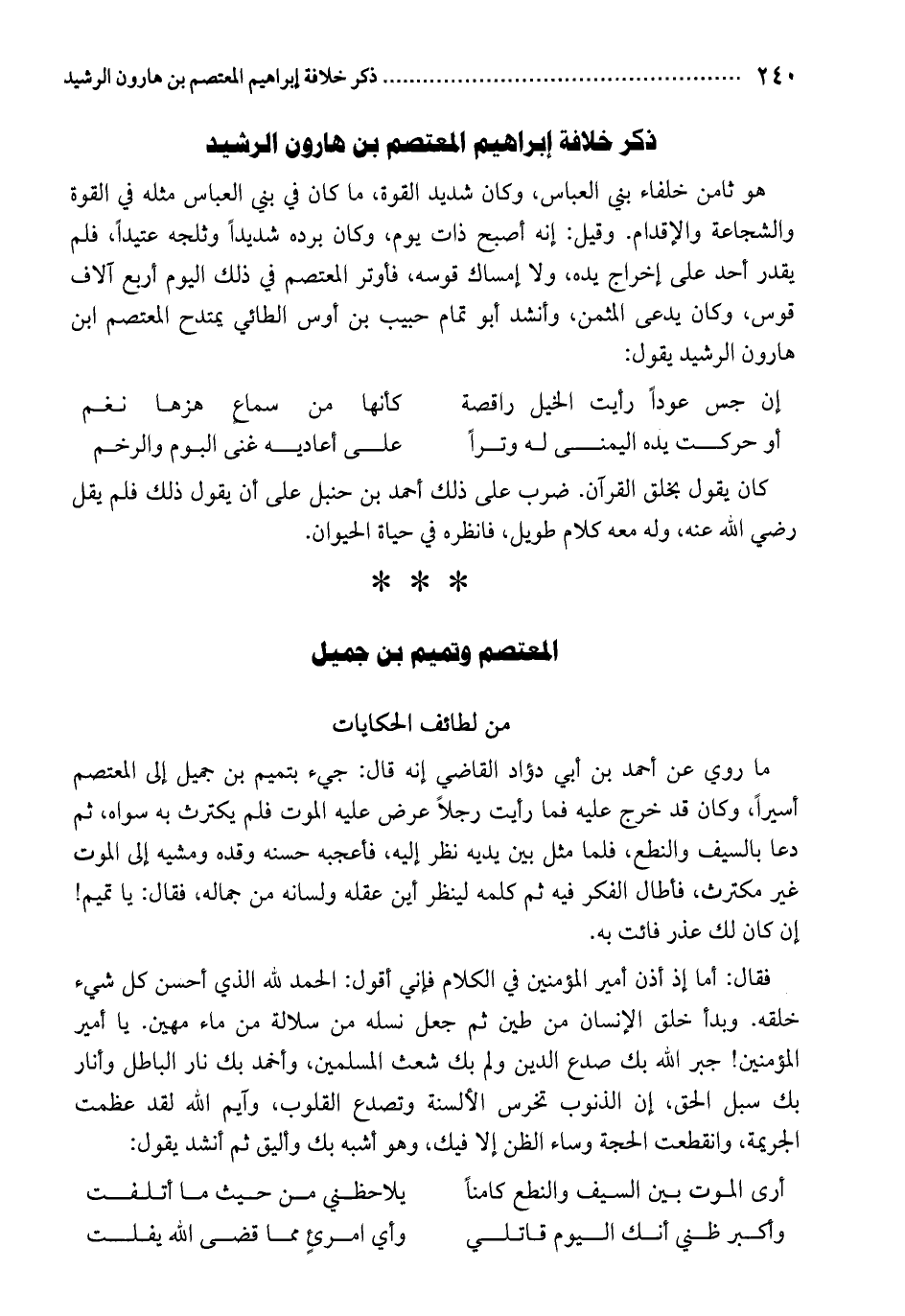 ذكر خلافة إبراهيم المعتصم بن هارون الرشيد هو ثامن خلفاء بني العباس، وكان شديد القوة، ما كان في بني العباس مثله في القوة والشجاعة والإقدام. وقيل: إنه أصبح ذات يوم، وكان برده شديداً وثلجه عتيداً، فلم يقدر أحد على إخراج يده، ولا إمساك قوسه، فأوتر المعتصم في ذلك اليوم أربع آلاف قوس، وكان يدعى المثمن، وأنشد أبو تمام حبيب بن أوس الطائي يمتدح المعتصم بن هارون الرشيد يقول:
