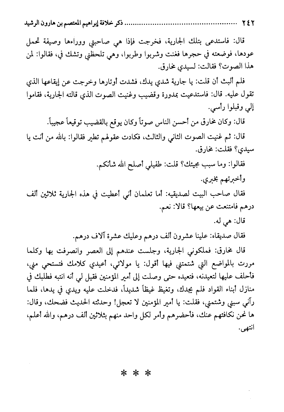 قال مخارق: فملكوني الجارية، وجلست عندهم إلى العصر وانصرفت بها وكلما مررت بالمواضع التي شتمتني فيها أقول: يا مولاتي، أعيدي كلامك فتستحي مني، فأحلف عليها لتعيدنه، فتعيده حتى وصلت إلى أمير المؤمنين فقيل لي أنه انتبه فطلبك في منازل أبناء القواد فلم يجدك، وتغيظ غيظاً شديداً، فدخلت عليه ويدي في يدها، فلما رآني سبني وشتمني، فقلت: يا أمير المؤمنين لا تعجل! وحدثته الحديث فضحك، وقال: ها نحن نكافئهم عنك، فأحضرهم وأمر لكل واحد منهم بثلاثين ألف درهم، والله أعلم، انتهى.