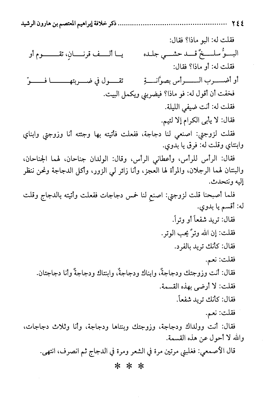 فلما أصبحنا قلت لزوجتي: اصنع لنا خمس دجاجات ففعلت وأتيته بالدجاج وقلت له: أقسم يا بدوي.