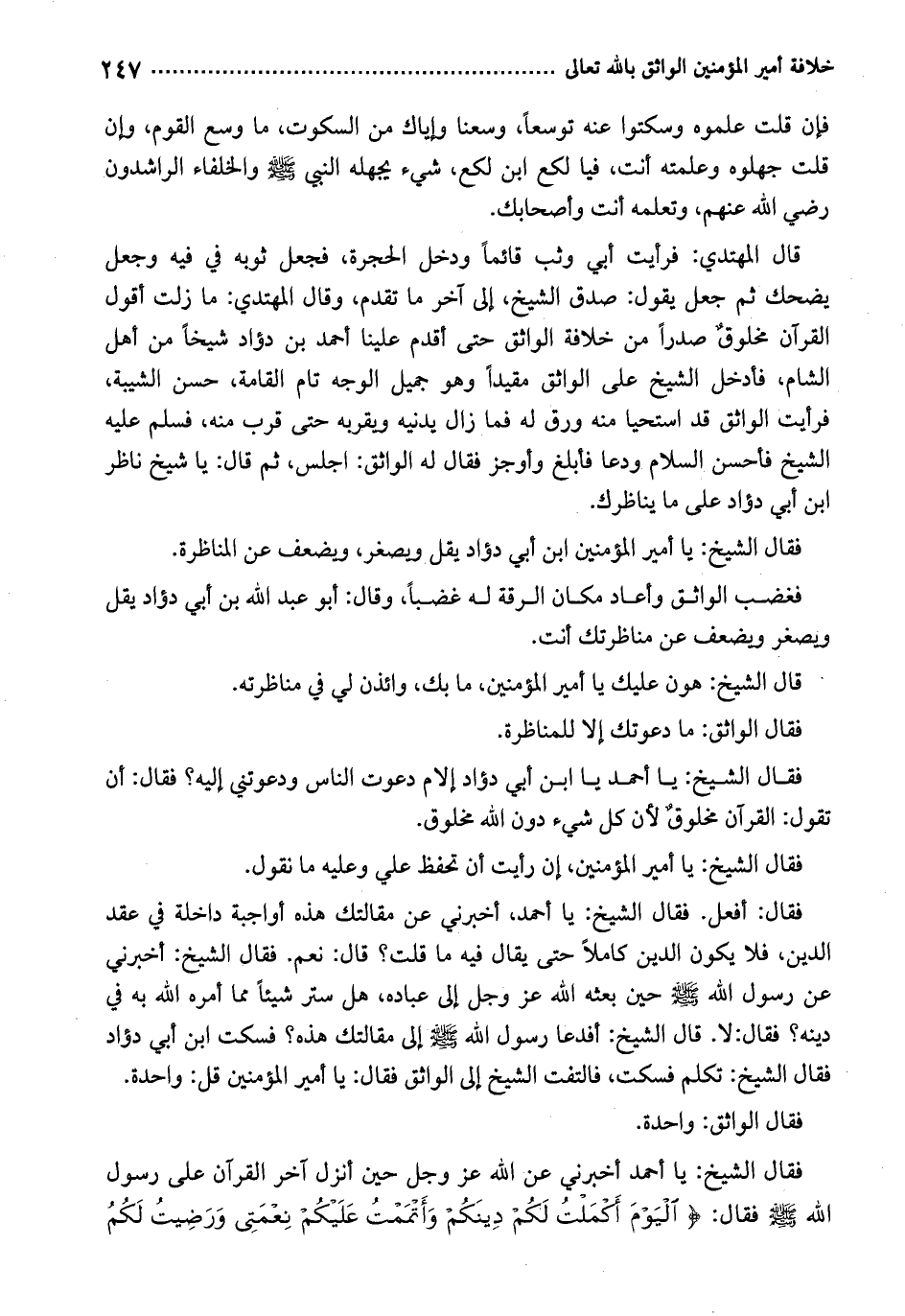 فقال: أفعل. فقال الشيخ: يا أحمد، أخبرني عن مقالتك هذه أواجبة داخلة في عقد الدين، فلا يكون الدين كاملاً حتى يقال فيه ما قلت؟ قال: نعم. فقال الشيخ: أخبرني عن رسول الله صَلَّى اللهُ عَلَيْهِ وَسَلَّمَ حين بعثه الله عز وجل إلى عباده، هل ستر شيئاً مما أمره الله به في دينه.؟ فقال: لا. قال الشيخ: أفدعا رسول الله صَلَّى اللهُ عَلَيْهِ وَسَلَّمَ إلى مقالتك هذه؟ فسكت ابن أبي دؤاد فقال الشيخ: تكلم فسكت، فالتفت الشيخ إلى الواثق فقال: يا أمير المؤمنين قل: واحدة.