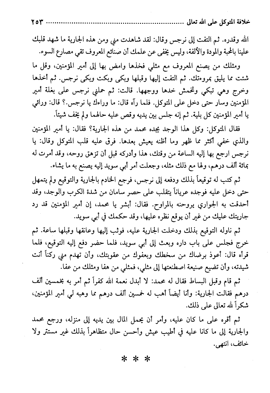 الله وقدره. ثم التفت إلى نرجس وقال: لقد شاهدت مني ومن هذه الجارية ما شهد قلبك علينا بالمحبة والمودة والألفة، وليس يخفى عن علمك أن صنائع المعروف تقي مصارع السوء. ومثلك من يصنع المعروف مع مثلي فخذها وامض بها إلى أمير المؤمنين، وقل ما شئت مما يليق بمروءتك. ثم التفت إليها وقبلها وبكى وبكت وبكى نرجس. ثم أخذها وخرج وهي تبكي وتخمش خدها ووجهها. قالت: ثم حملني نرجس على بغلة أمير المؤمنين وسار حتى دخل على المتوكل. فلما رآه قال: ما وراءك يا نرجس.؟ قال: ورائي يا أمير المؤمنين كل بلية. ثم إنه جلس بين يديه وقص عليه حالهما ولم يخف شيئاً.