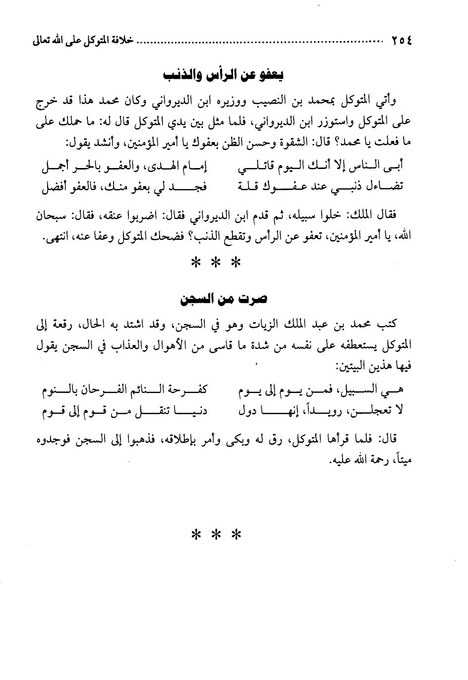 قال: فلما قرأها المتوكل، رق له وبكى وأمر بإطلاقه، فذهبوا إلى السجن فوجدوه ميتاً، رحمة الله عليه.