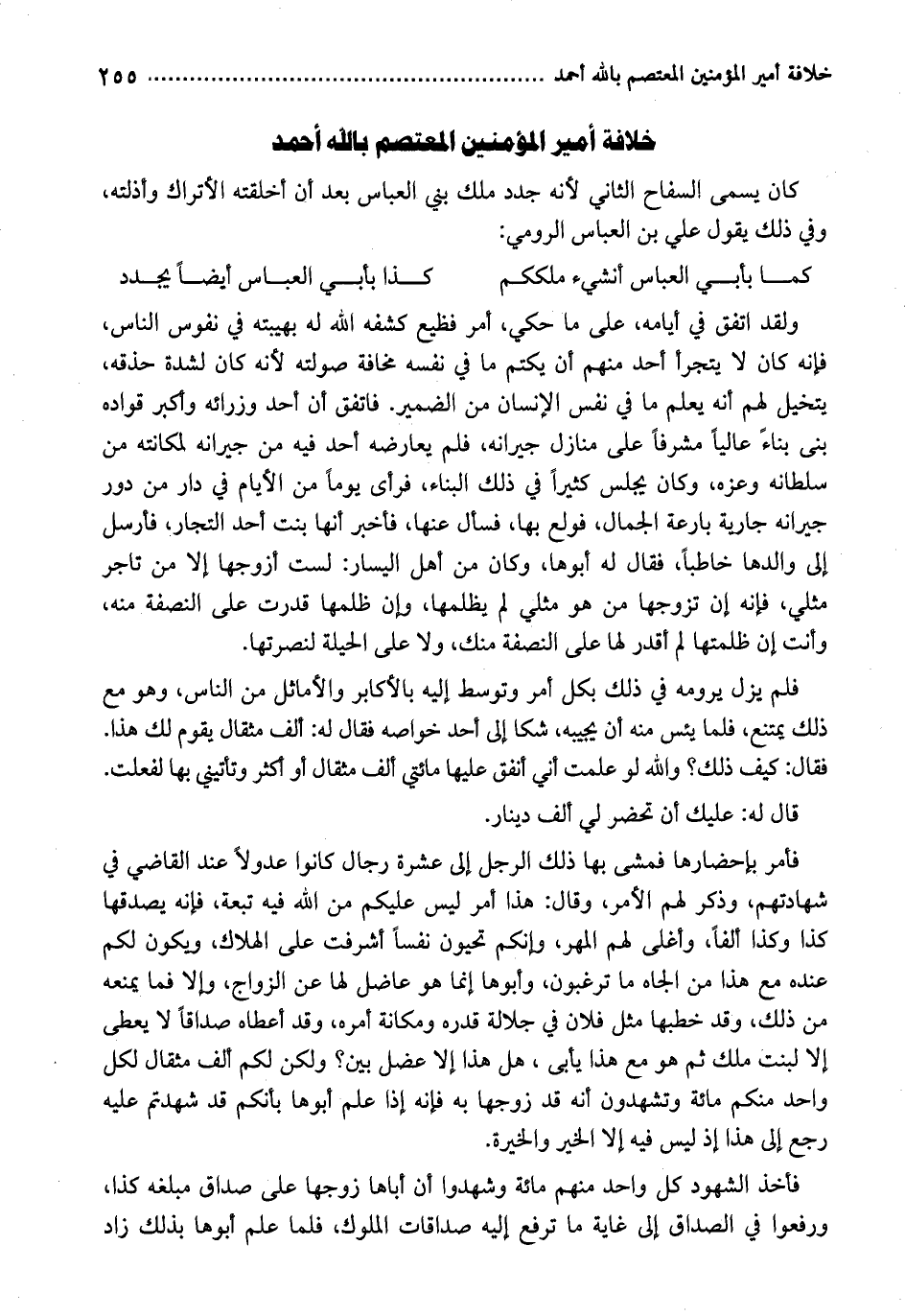 ولقد اتفق في أيامه، على ما حكي، أمر فظيع كشفه الله له بهيبته في نفوس الناس، فإنه كان لا يتجرأ أحد منهم أن يكتم ما في نفسه مخافة صولته لأنه كان لشدة حذقه، يتخيل لهم أنه يعلم ما في نفس الإنسان من الضمير. فاتفق أن أحد وزرائه وأكبر قواده بني بناء عالياً مشرفاً على منازل جيرانه، فلم يعارضه أحد فيه من جيرانه لمكانته من سلطانه وعزه، وكان يجلس كثيراً في ذلك البناء، فرأى يوماً من الأيام في دار من دور جيرانه جارية بارعة الجمال، فولع بها، فسأل عنها، فأخبر أنها بنت أحد التجار، فأرسل إلى والدها خاطباً، فقال له أبوها، وكان من أهل اليسار: لست أزوجها إلا من تاجر مثلي، فإنه إن تزوجها من هو مثلي لم يظلمها، وإن ظلمها قدرت على النصفة منه، وأنت إن ظلمتها لم أقدر لها على النصفة منك، ولا على الحيلة لنصرتها.