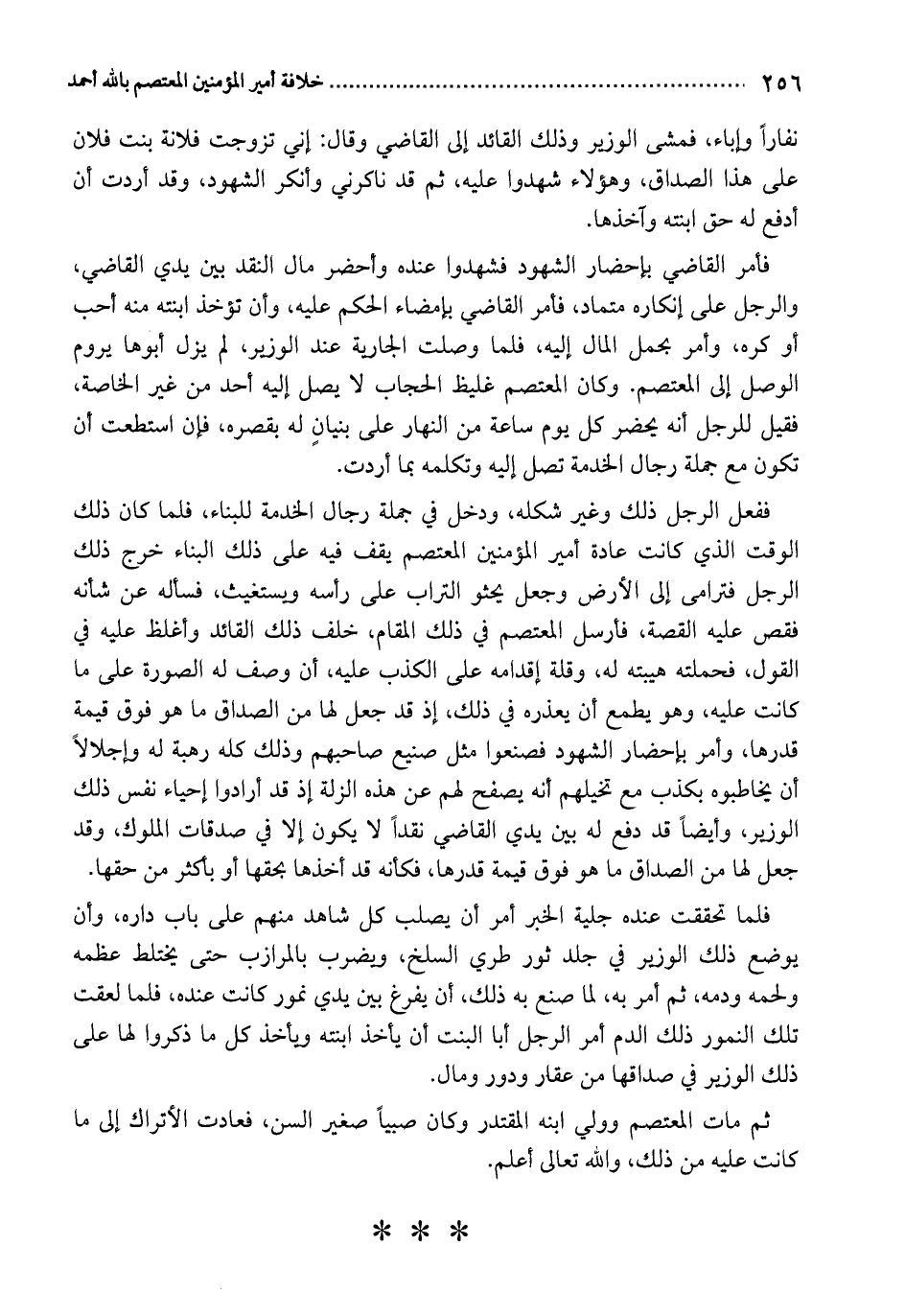 ففعل الرجل ذلك وغير شكله، ودخل في جملة رجال الخدمة للبناء، فلما كان ذلك الوقت الذي كانت عادة أمير المؤمنين المعتصم يقف فيه على ذلك البناء خرج ذلك الرجل فترامى إلى الأرض وجعل يحثو التراب على رأسه ويستغيث، فسأله عن شأنه فقص عليه القصة، فأرسل المعتصم في ذلك المقام، خلف ذلك القائد وأغلظ عليه في القول، فحملته هيبته له، وقلة إقدامه على الكذب عليه، أن وصف له الصورة على ما كانت عليه، وهو يطمع أن يعذره في ذلك، إذ قد جعل لها من الصداق ما هو فوق قيمة قدرها، وأمر بإحضار الشهود فصنعوا مثل صنيع صاحبهم وذلك كله رهبة له وإجلالاً أن يخاطبوه بكذب مع تخيلهم أنه يصفح لهم عن هذه الزلة إذ قد أرادوا إحياء نفس ذلك الوزير، وأيضاً قد دفع له بين يدي القاضي نقداً لا يكون إلا في صدقات الملوك، وقد جعل لها من الصداق ما هو فوق قيمة قدرها، فكأنه قد أخذها بحقها أو بأكثر من حقها.