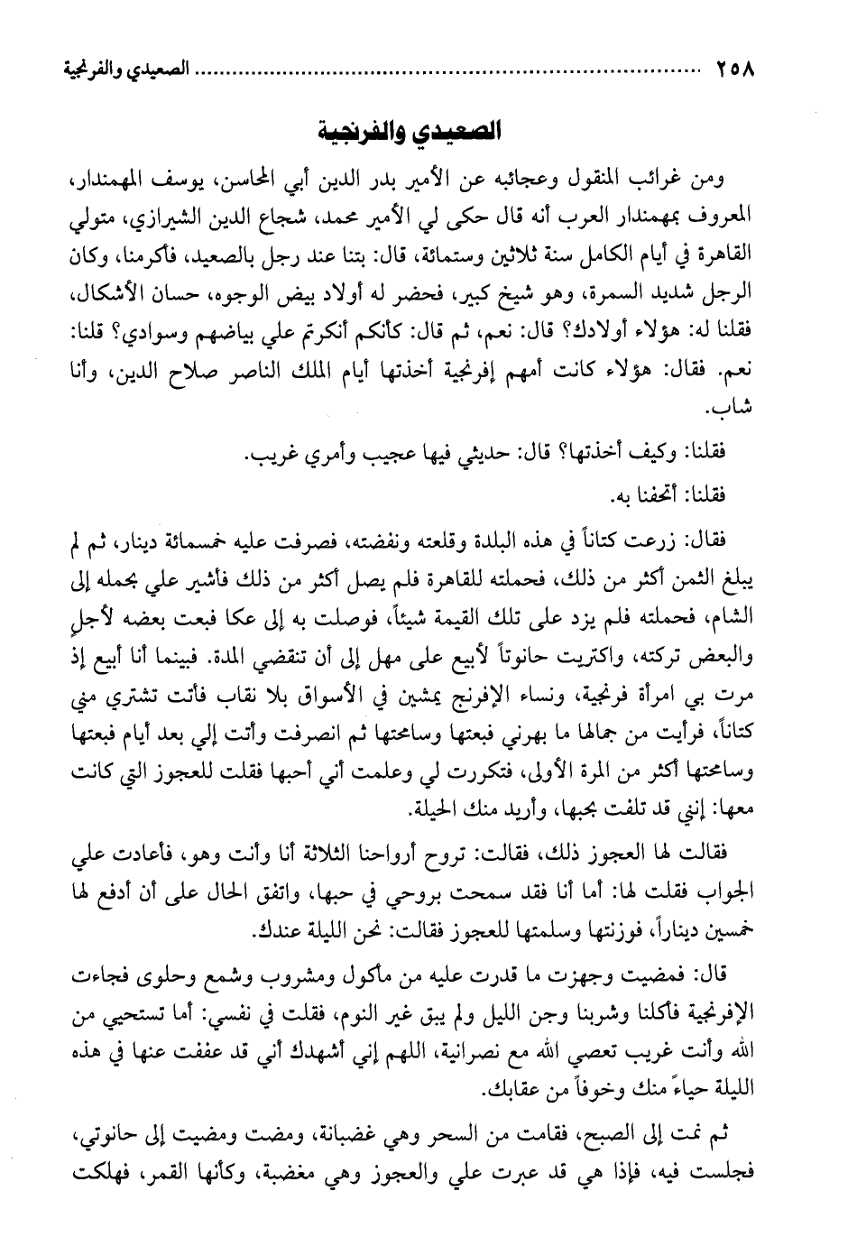 ومن غرائب المنقول وعجائبه عن الأمير بدر الدين أبي المحاسن، يوسف المهمندار، المعروف بمهمندار العرب أنه قال حكى لي الأمير محمد، شجاع الدين الشيرازي، متولي القاهرة في أيام الكامل سنة ثلاثين وستمائة، قال: بتنا عند رجل بالصعيد، فأكرمنا، وكان الرجل شديد السمرة، وهو شيخ كبير، فحضر له أولاد بيض الوجوه، حسان الأشكال، فقلنا له: هؤلاء أولادك؟ قال: نعم، ثم قال: كأنكم أنكرتم علي بياضهم وسوادي؟ قلنا: نعم. فقال: هؤلاء كانت أمهم إفرنجية أخذتها أيام الملك الناصر صلاح الدين، وأنا شاب.