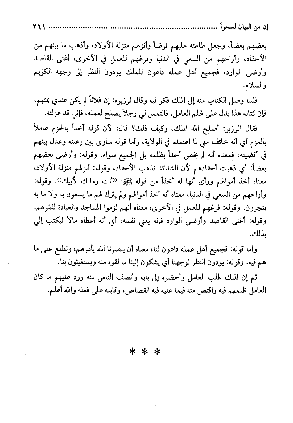 فقال الوزير: أصلح الله الملك، وكيف ذلك؟ قال: لأن قوله آخذاً بالحزم عاملاً بالعزم أي أنه خائف مني لما اعتمده في الولاية، وأما قوله ساوى بين رعيته وعدل بينهم في أقضيته، فمعناه أنه لم يخص أحداً بظلمه بل الجميع سواء، وقوله: وأرضى بعضهم بعضاً: أي ذهبت أحقادهم لأن الشدائد تذهب الأحقاد، وقوله: أنزلهم منزلة الأولاد، معناه أخذ أموالهم ورأى أنها له أخذاً من قوله صَلَّى اللهُ عَلَيْهِ وَسَلَّمَ: " أنت ومالك لأبيك ". وقوله: وأراحهم من السعي في الدنيا، معناه أنه أخذ أموالهم ولم يترك لهم ما يسعون به ولا ما به يتجرون. وقوله: فرغهم للعمل في الأخرى، معناه أنهم لزموا المساجد والعبادة لفقرهم. وقوله: أغنى القاصد وأرضى الوارد فإنه يعني نفسه، أي أنه أعطاه مالاً ليكتب إلي بذلك. وأما قوله: فجميع أهل عمله داعون لنا، معناه أن يبصرنا الله بأمرهم، ونطلع على ما هم فيه. وقوله: يودون النظر لوجهنا أي يشكون إلينا ما لقوه منه ويستغيثون بنا.