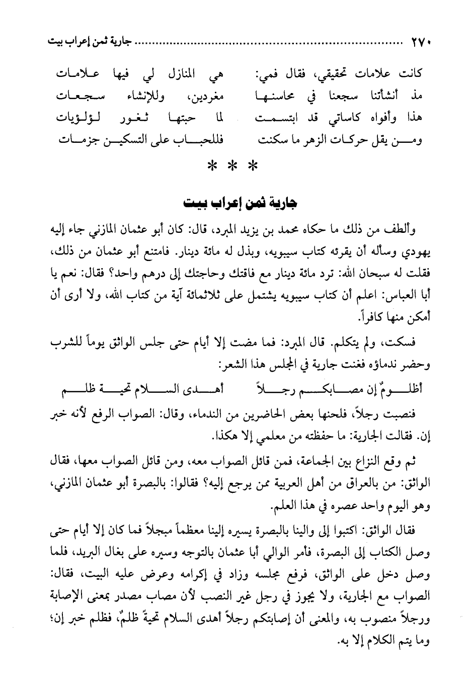 فقال الواثق: اكتبوا إلى والينا بالبصرة يسيره إلينا معظماً مبجلاً فما كان إلا أيام حتى وصل الكتاب إلى البصرة، فمر الوالي أبا عثمان بالتوجه وسيره على بغال البريد، فلما وصل دخل على الواثق، فرفع مجلسه وزاد في إكرامه وعرض عليه البيت، فقال: الصواب مع الجارية، ولا يجوز في رجل غير النصب لأن مصاب مصدر بمعنى الإصابة ورجلاً منصوب به، والمعنى أن إصابتكم رجلاً أهدى السلام تحيةً ظلمٌ، فظلم خبر إن؛ وما يتم الكلام إلا به.