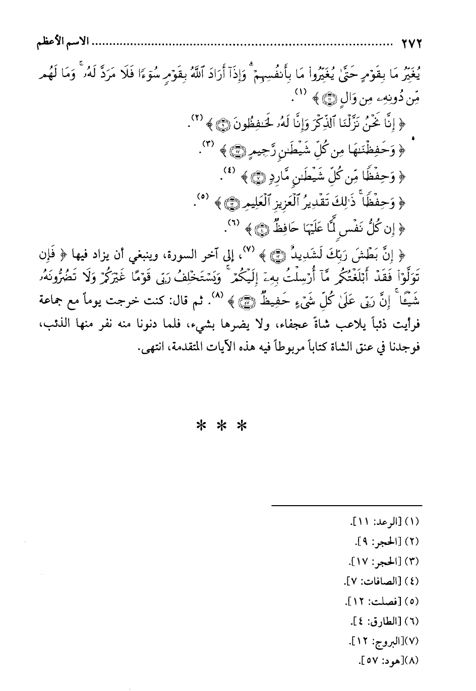إنا نحن نزلنا الذكر وإنا له لحافظون "، " وحفظناها من كل شيطان رجيم "، " وحفظاً من كل شيطان مارد "، " وحفظا ذلك تقدير العزيز العليم "، " إن كل نفس لما عليها حافظ "، " إن بطش ربك لشديد "، إلى آخر السورة، وينبغي أن يزاد فيها " إن ربي على كل شيء حفيظ ". ثم قال: كنت خرجت يوماً مع جماعة فرأيت ذئباً يلاعب شاةً عجفاء، ولا يضرها بشيء، فلما دنونا منه نفر منها الذئب، فوجدنا في عنق الشاة كتاباً مربوطاً فيه هذه الآيات المتقدمة، انتهى.