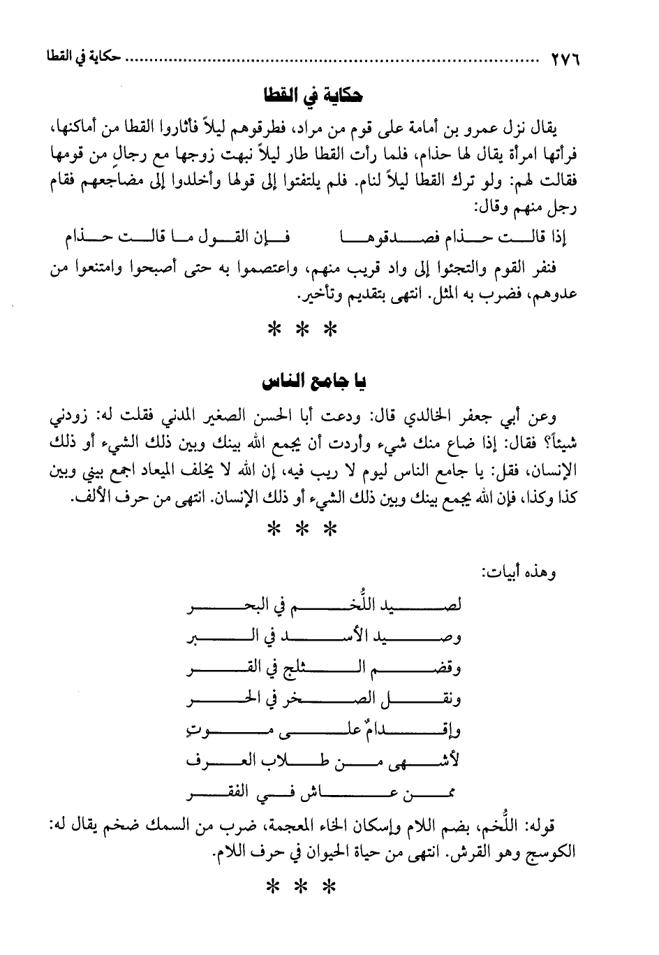 وعن أبي جعفر الخالدي قال: ودعت أبا الحسن الصغير المدني فقلت له: زودني شيئاً؟ فقال: إذا ضاع منك شيء وأردت أن يجمع الله بينك وبين ذلك الشيء أو ذلك الإنسان، فقل: يا جامع الناس ليوم لا ريب فيه، إن الله لا يخلف الميعاد اجمع بيني وبين كذا وكذا، فإن الله يجمع بينك وبين ذلك الشيء أو ذلك الإنسان. انتهى من حرف الألف.