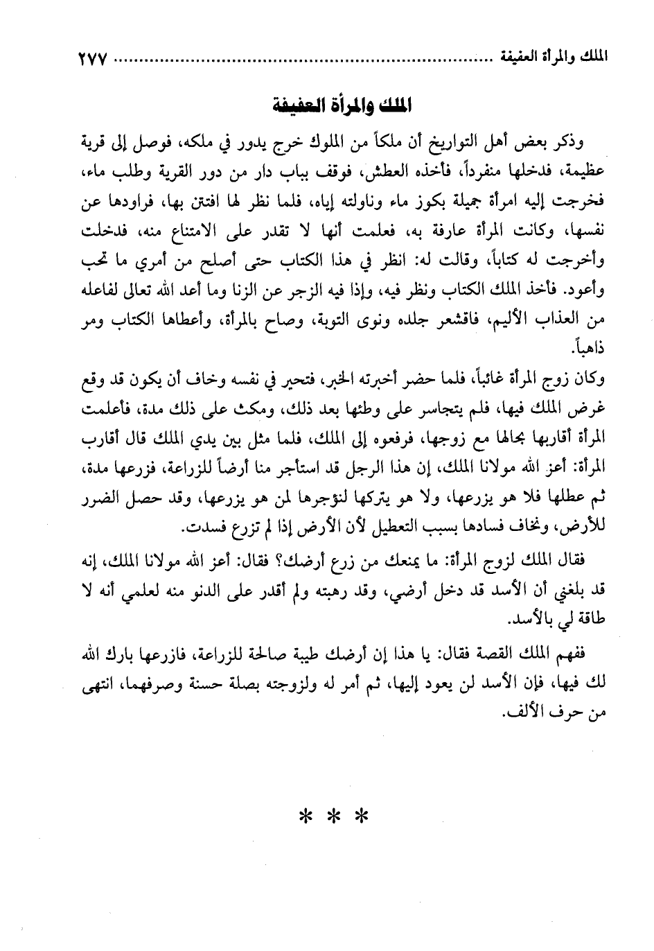 وذكر بعض أهل التواريخ أن ملكاً من الملوك خرج يدور فلي ملكه، فوصل إلى قرية عظيمة، فدخلها منفرداً، فأخذه العطش، فوقف بباب دار من دور القرية وطلب ماء، فخرجت إليه امرأة جميلة بكوز ماء وناولته إياه، فلما نظر لها افتتن بها، فراودها عن نفسها، وكانت المرأة عارفة به، فعلمت أنها لا تقدر على الامتناع منه، فدخلت وأخرجت له كتابً، وقالت له: انظر في هذا الكتاب حتى أصلح من أمري ما تحب وأعود. فأخذ الملك الكتاب ونظر فيه، وإذا فيه الزجر عن الزنا وما أعد الله تعالى لفاعله من العذاب الأليم، فاقشعر جلده ونوى التوبة، وصاح بالمرأة، وأعطاها الكتاب ومر ذاهباً.