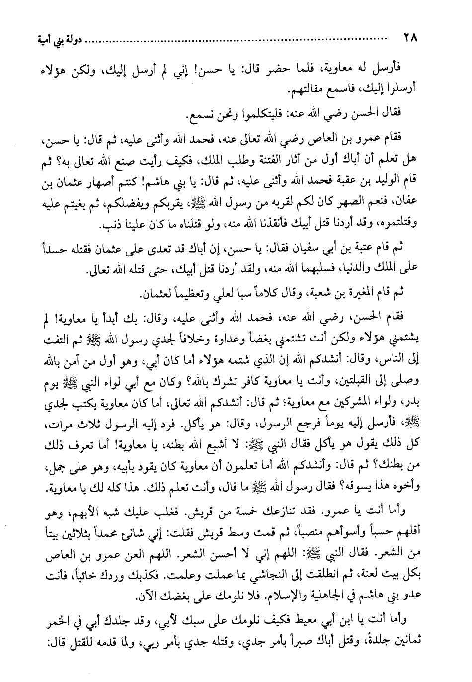 فقام عمرو بن العاص رضي الله تعالى عنه، فحمد الله وأثنى عليه، ثم قال: يا حسن، هل تعلم أن أباك أول من أثار الفتنة وطلب الملك، فكيف رأيت صنع الله تعالى به؟ ثم قام الوليد بن عقبة فحمد الله وأثنى عليه، ثم قال: يا بني هاشم! كنتم أصهار عثمان بن عفان، فنعم الصهر كان لكم لقربه من رسول الله صَلَّى اللهُ عَلَيْهِ وَسَلَّمَ، يقربكم ويفضلكم، ثم بغيتم عليه وقتلتموه، وقد أردنا قتل أبيك فأنقذنا الله منه، ولو قتلناه ما كان علينا ذنب.