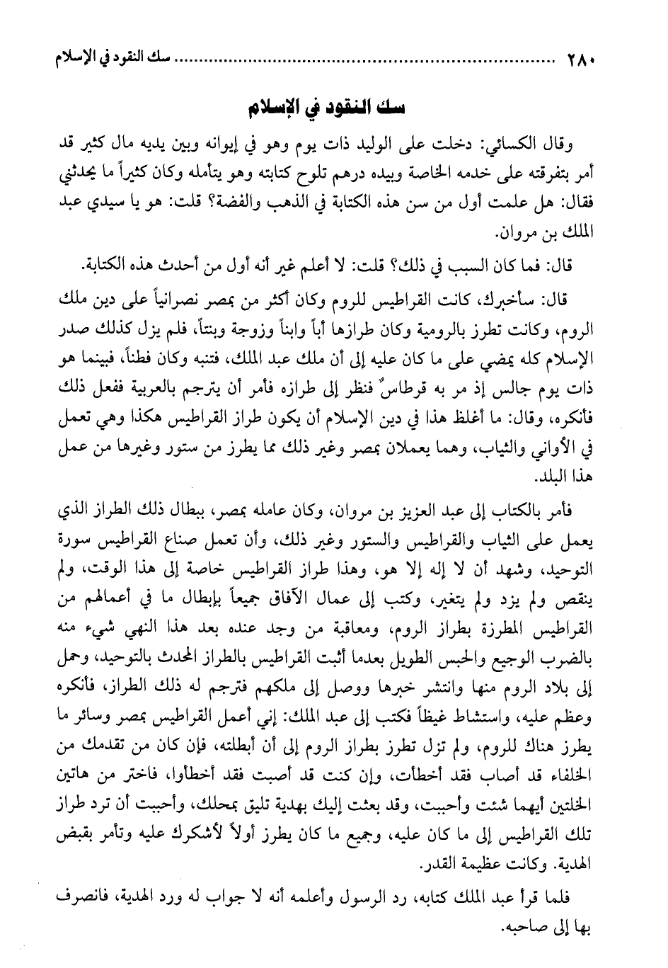 قال: سأخبرك، كانت القراطيس للروم وكان أكثر من بمصر نصرانياً على دين ملك الروم، وكانت تطرز بالرومية وكان طرازها أباً وابناً وزوجة وبنتاً، فلم يزل كذلك صدر الإسلام كله يمضي على ما كان عليه إلى أن ملك عبد الملك، فتنبه وكان فطناً، فبينما هو ذات يوم جالس إذ مر به قرطاسٌ فنظر إلى طرازه فأمر أن يترجم بالعربية ففعل ذلك فأنكره، وقال: ما أغلظ هذا في دين الإسلام أن يكون طراز القراطيس هكذا وهي تعمل في الأواني والثياب، وهما يعملان بمصر وغير ذلك مما يطرز من ستور وغيرها من عمل هذا البلد. فأمر بالكتاب إلى عبد العزيز بن مروان، وكان عامله بمصر، ببطال ذلك الطراز الذي يعمل على الثياب والقراطيس والستور وغير ذلك، وأن تعمل صناع القراطيس سورة التوحيد، وشهد أن لا إله إلا هو، وهذا طراز القراطيس خاصة إلى هذا الوقت، ولم ينقص ولم يزد ولم يتغير، وكتب إلى عمال الآفاق جميعاً بإبطال ما في أعمالهم من القراطيس المطرزة بطراز الروم، ومعاقبة من وجد عنده بعد هذا النهي شيء منه بالضرب الوجيع والحبس الطويل بعدما أثبت القراطيس بالطراز المحدث بالتوحيد، وحمل إلى بلاد الروم منها وانتشر خبرها ووصل إلى ملكهم فترجم له ذلك الطراز، فأنكره وعظم عليه، واستشاط غيظاً فكتب إلى عبد الملك: إني أعمل القراطيس بمصر وسائر ما يطرز هناك للروم، ولم تزل تطرز بطراز الروم إلى أن أبطلته، فإن كان من تقدمك من الخلفاء قد أصاب فقد أخطأت، وإن كنت قد أصبت فقد أخطأوا، فاختر من هاتين الخلتين أيهما شئت وأحببت، وقد بعثت إليك بهدية تليق بمحلك، وأحببت أن ترد طراز تلك القراطيس إلى ما كان عليه، وجميع ما كان يطرز أولاً لأشكرك عليه وتأمر بقبض الهدية. وكانت عظيمة القدر.
