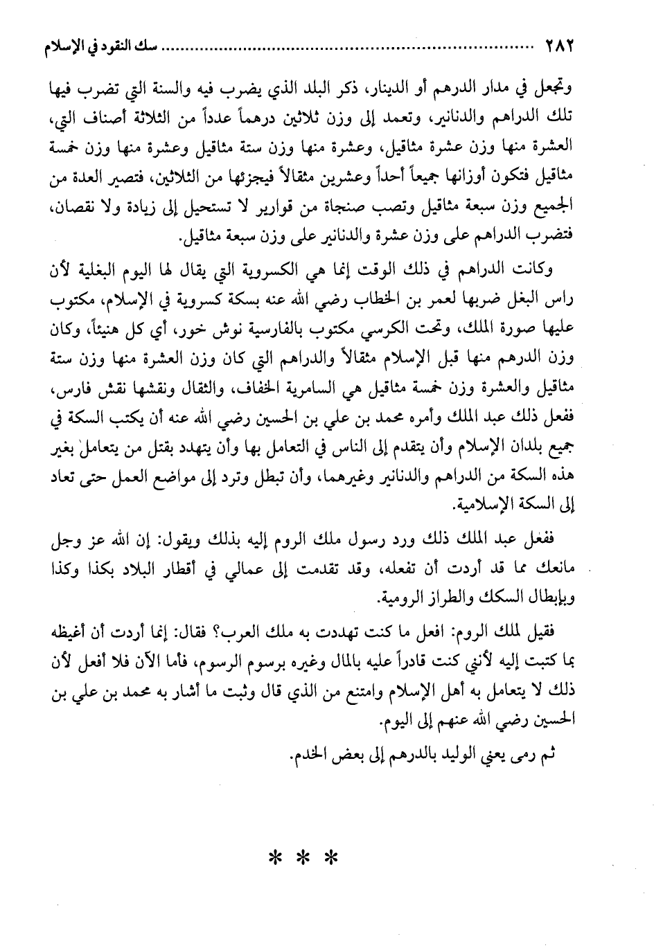فقيل لملك الروم: افعل ما كنت تهددت به ملك العرب.؟ فقال: إنما أردت أن أغيظه بما كتبت إليه لأنني كنت قادراً عليه بالمال وغيره برسوم الرسوم، فأما الآن فلا أفعل لأن ذلك لا يتعامل به أهل الإسلام وامتنع من الذي قال وثبت ما أشار به محمد بن علي بن الحسين رضي الله عنهم إلى اليوم.