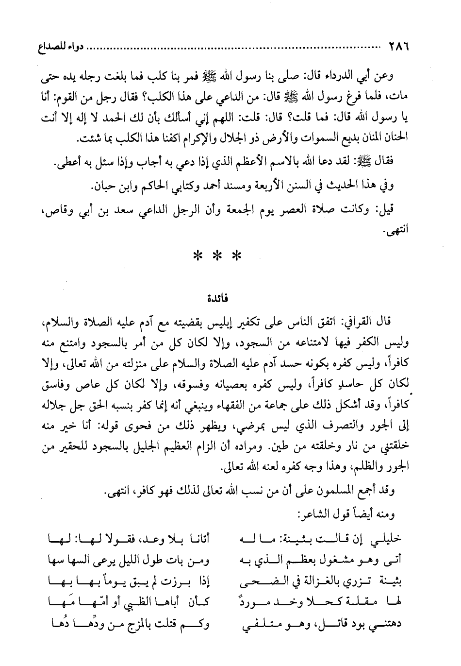 وعن أبي الدرداء قال: صلى بنا رسول الله صَلَّى اللهُ عَلَيْهِ وَسَلَّمَ فمر بنا كلب فما بلغت رجله يده حتى مات، فلما فرغ رسول الله صَلَّى اللهُ عَلَيْهِ وَسَلَّمَ قال: من الداعي على هذا الكلب؟ فقال رجل من القوم: أنا يا رسول الله قال: فما قلت؟ قال: قلت: اللهم إني أسألك بأن لك الحمد لا إله إلا أنت الحنان المنان بديع السموات والأرض ذو الجلال والإكرام اكفنا هذا الكلب بما شئت.
