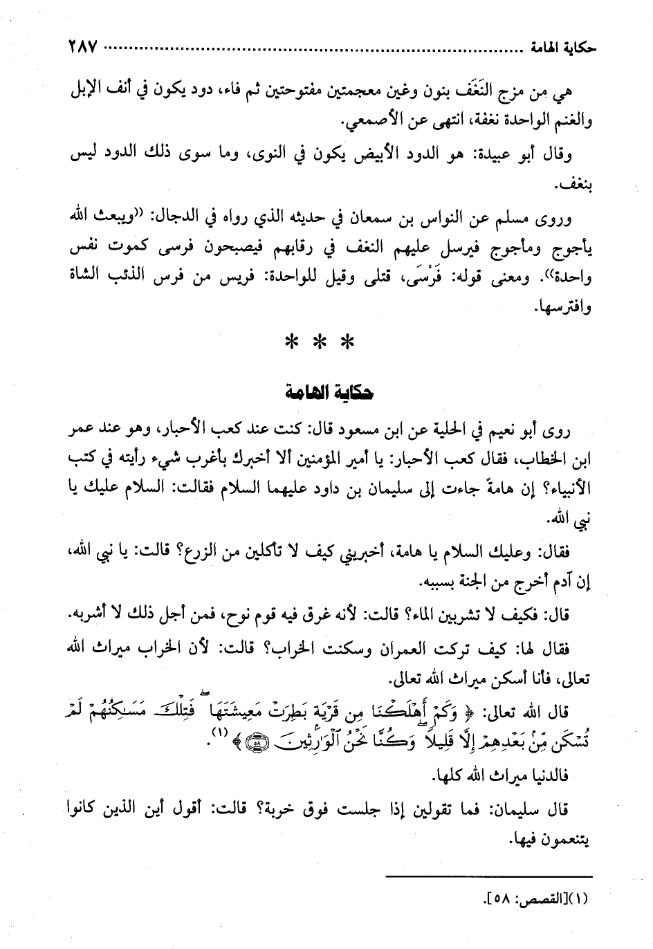 فقال: وعليك السلام يا هامة، أخبريني كيف لا تأكلين من الزرع؟ قالت: يا نبي الله، إن آدم أخرج من الجنة بسببه.