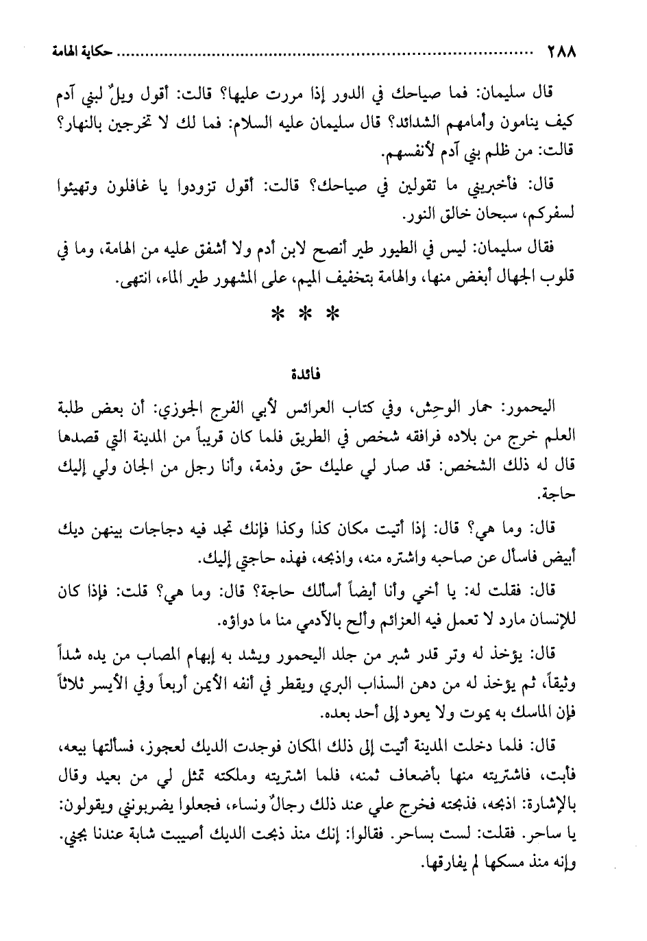 فقال سليمان: ليس في الطيور طير أنصح لابن أدم ولا أشفق عليه من الهامة، وما في قلوب الجهال أبغض منها، والهامة بتخفيف الميم، على المشهور طير الماء، انتهى.