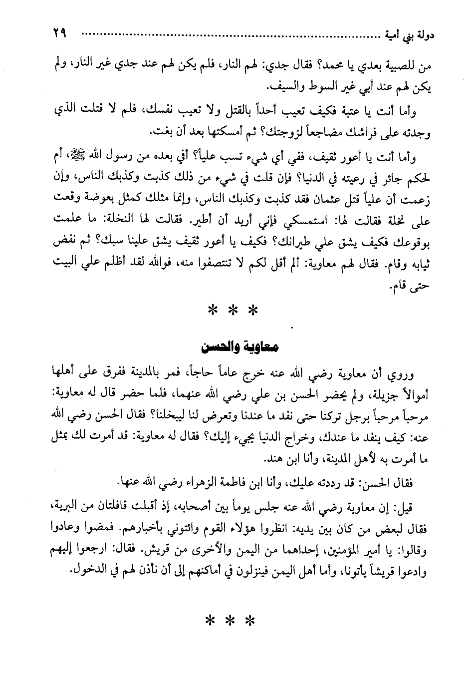 وروي أن معاوية رضي الله عنه خرج عاماً حاجاً، فمر بالمدينة ففرق على أهلها أموالاً جزيلة، ولم يحضر الحسن بن علي رضي الله عنهما، فلما حضر قال له معاوية: مرحباً مرحباً برجل تركنا حتى نفد ما عندنا وتعرض لنا ليبخلنا؟ فقال الحسن رضي الله عنه: كيف ينفد ما عندك، وخراج الدنيا يجيء إليك؟ فقال له معاوية: قد أمرت لك بمثل ما أمرت به لأهل المدينة، وأنا ابن هند.
